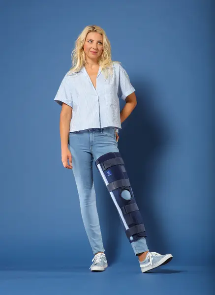 Długa orteza pooperacyjna do stabilizacji kolana z możliwością regulacji zgięcia/wyprostu.
