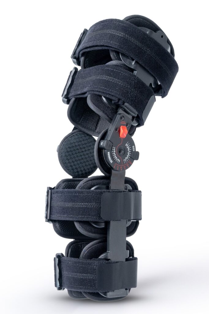 Zawiasowa orteza umożliwiająca kontrolę zgięcia i wyprostu w trakcie leczenia i powrotu do aktywności.