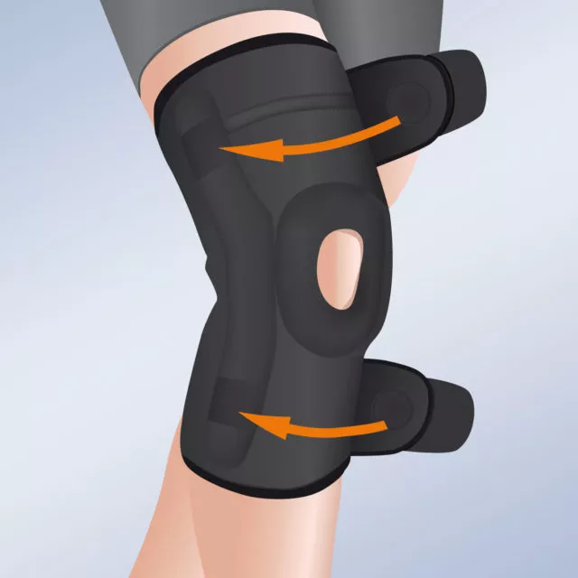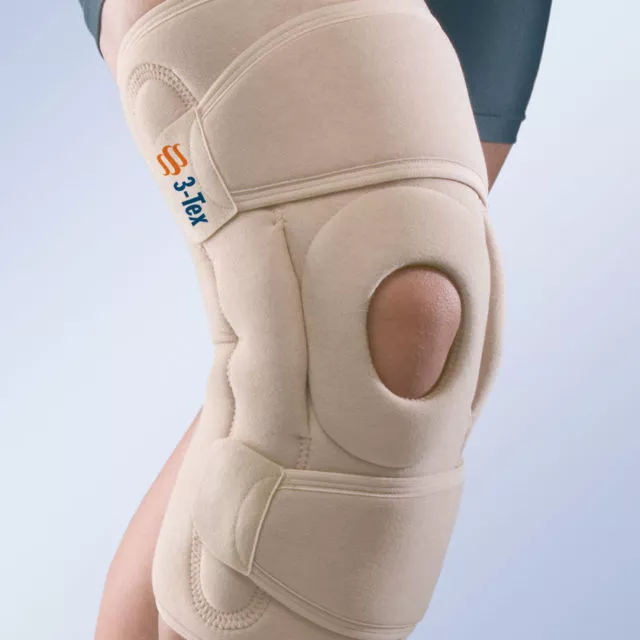 Otwierana orteza z szynami bocznymi i regulacją zgięcia/wyprostu do terapii po urazach i zabiegach.