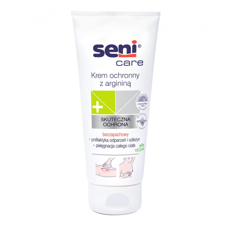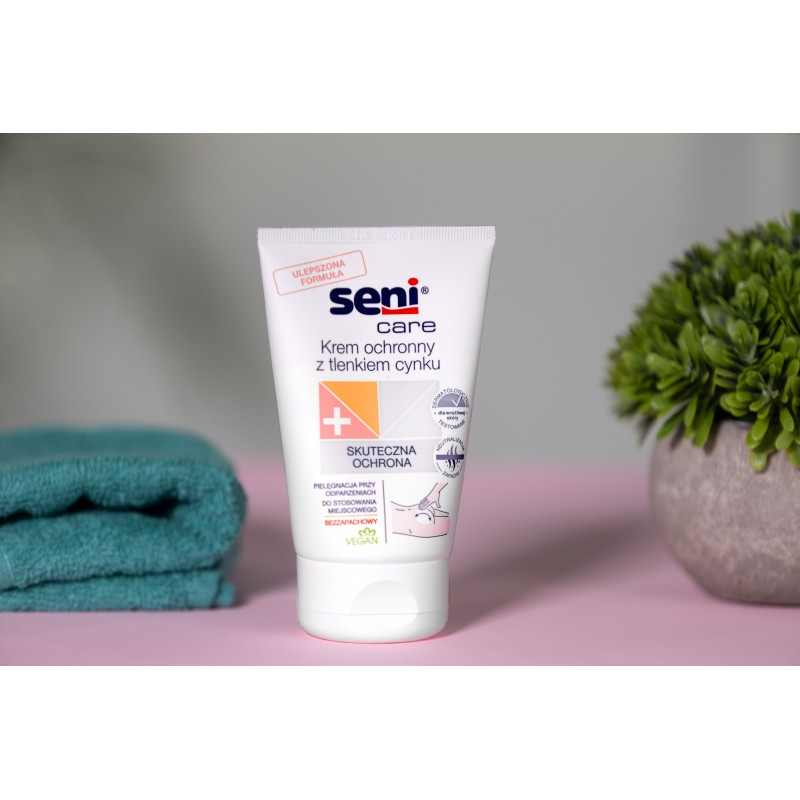 Krem ochronny Seni Care z tlenkiem cynku (16% składu) przeznaczony jest do pielęgnacji i ochrony skóry w miejscach narażonych na powstawanie odparzeń i odleżyn. Wspomaga regenerację naskórka i chroni przed działaniem substancji drażniących. Nie zawiera wody, konserwantów i substancji zapachowych. Bogaty w składniki aktywne wspomagające pielęgnację wrażliwej skóry.