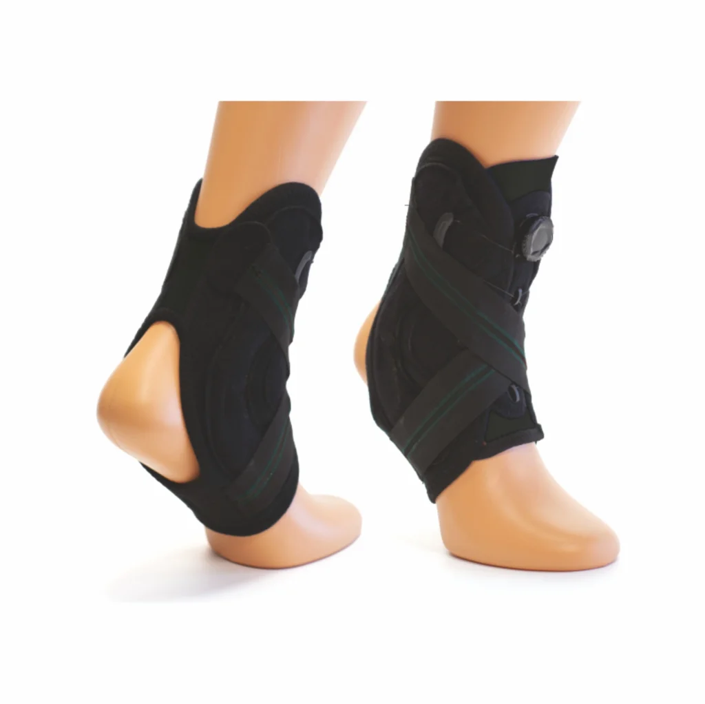 Półsztywna orteza stawu skokowego ze sznurowaniem i pasami krzyżowymi do silnej stabilizacji po urazach.