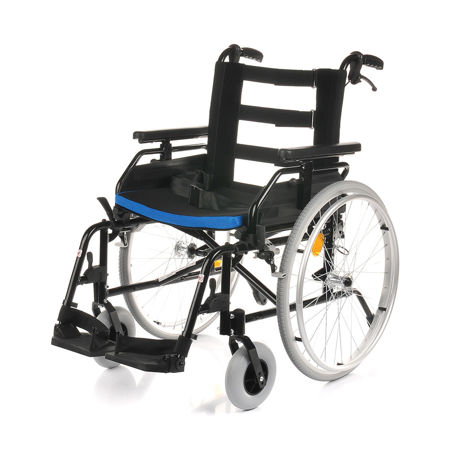 Aluminiowy wózek z profilowaną ergonomicznie pozycją siedzącą; nacisk na komfort dłuższego siedzenia.