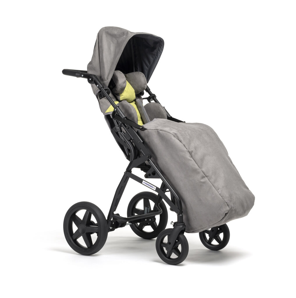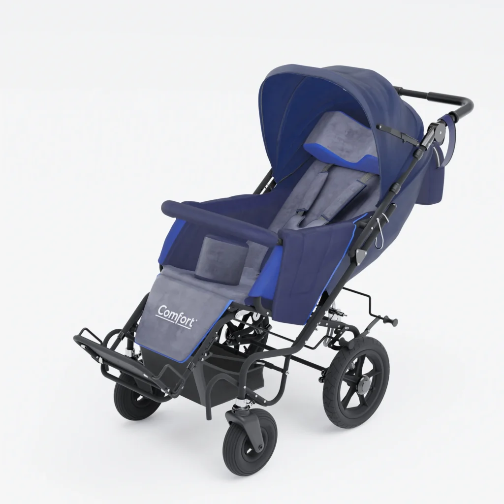 Wózek dziecięcy z rozbudowanymi regulacjami i stabilizacją tułowia, do codziennej rehabilitacji i transportu.